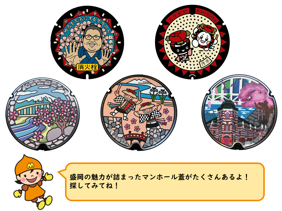 近年では各自治体が「ご当地デザインマンホール蓋」を設置しており、盛岡市内でも見て楽しいデザインマンホール蓋が増えています。お散歩の途中には、ぜひ足元にもご注目ください!
