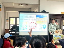 上下水道局では、リース制作の合間に水と森に関する出前講座を行い、水源である森林の役割の説明を行いました。